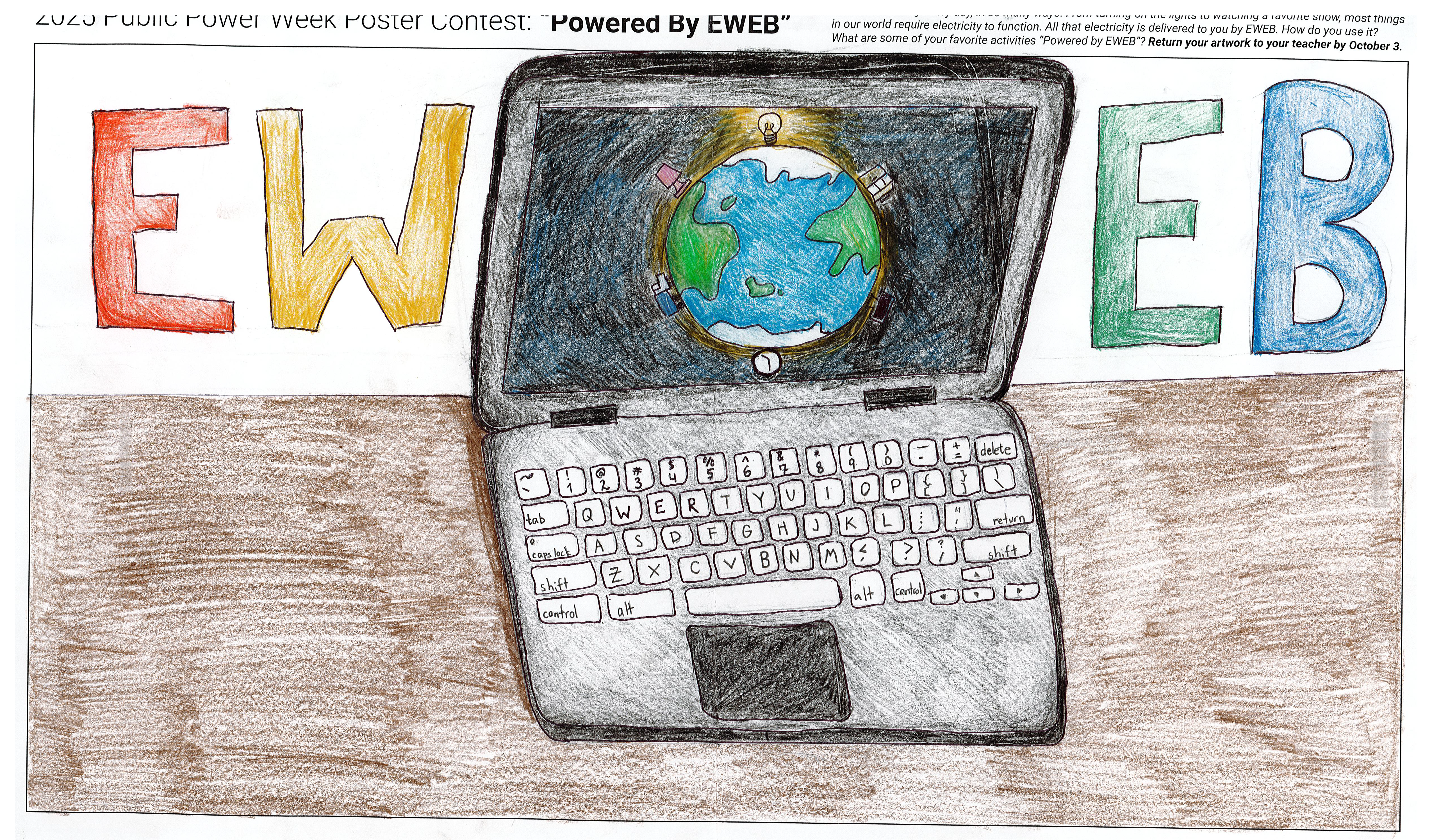 This year’s poster contest theme was “Powered by EWEB.” The winning submissions celebrated public power week and illustrated how electricity powers the devices we use in everyday life and the complex network of infrastructure that makes it all possible!