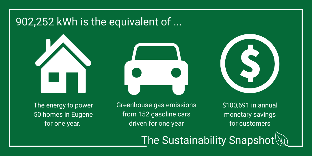 The Sustainability Snapshot, a recurring feature, highlights impactful projects completed by EWEB's Customer Solutions department, as a way to celebrate the meaningful work happening behind the scenes. While these inspiring stories typically go untold, by sharing them we hope to help the community better understand how conservation efforts support energy and water efficiency, equity and sustainability across Eugene and Springfield.